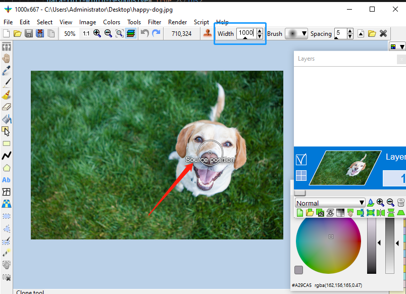 4. Set the "Width"=1000, right-click to select the object you want to clone and a message string of "Source position" will appear.