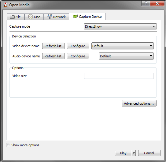 From here you can choose the Capture Mode and the Video/Audio Device Name. The user can also adjust the configuration for these devices by clicking Configure. The user is also able to set the size of the video that will be played by the Direct Show plugin and options such as 'Device Properties' and 'Tuner Properties' by clicking Advanced Options.