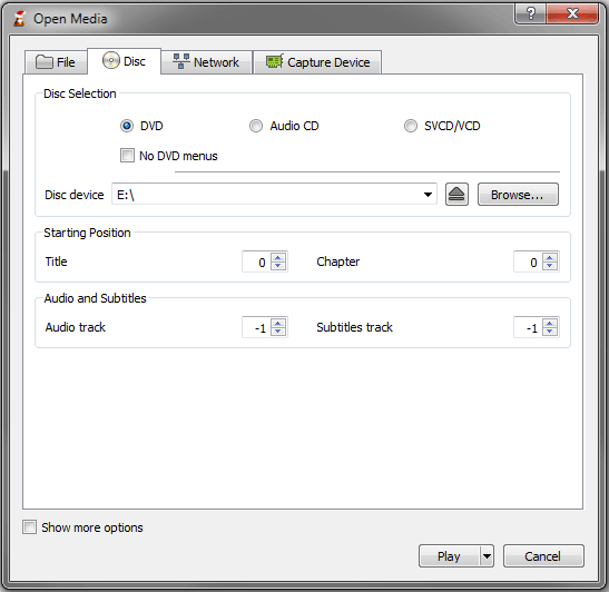 Start VLLC, open the "Media" menu, and select the "Open Disc..." menu item. An Open Disc dialog box will appear. Select the DVD you want to open and select Open.