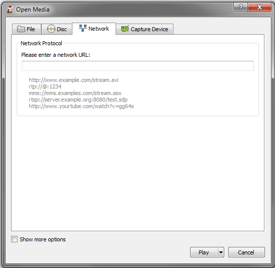 If you get some stuttering during playback, you can try to increase the size of the read buffer. This can be done in the Open Network Stream dialog box, by firstly checking the Show more options check box then adjusting the Caching selector, which allows you to choose the amount of time (in milliseconds) VLC should store data in its buffer before starting playback.