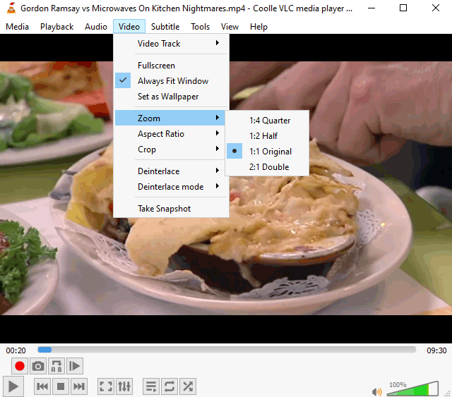You can enlarge videos in different sizes. This option is useful if you want to change the size of a video track which is being played. The supported sizes are 1:4 Quarter, 1:2 Half, 1:1 Original (default) and 2:1 Double.