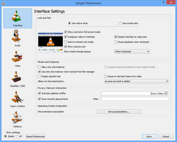 Here is the Simple Preferences panel where you can modify the essential settings of VLLC.