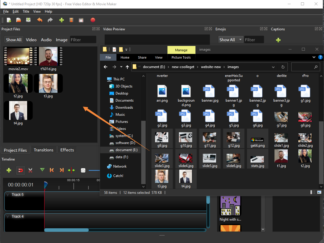 Before we can begin making a video, we need to import media files into Free Video Editor & Movie maker. Most video, image and music file formats will work. Drag and drop a few videos or images and a music file from your Desktop to Free Video Editor & Movie maker. Be sure to drop the files where the arrow in the illustration is pointing to.
