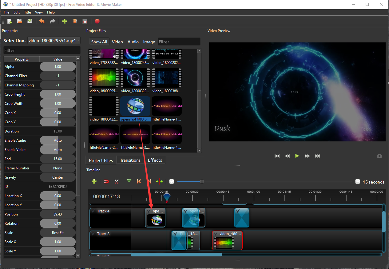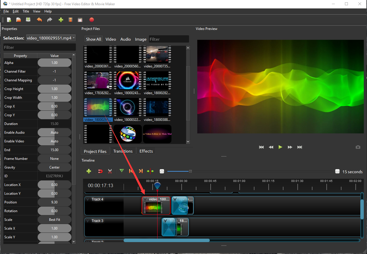 Next, drag each video or photo onto a track in the timeline (as seen in the illustration). The timeline represents your final video, so arrange your photos in whatever sequence you want them to appear in your video. If you overlap two clips, Free Video Editor & Movie maker will automatically create a smooth fade between them, displayed by blue rounded rectangles between the clips. Remember, you can rearrange the clips as many times as needed by simply dragging and dropping them.