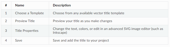 Free Video Editor & Movie maker can use any vector SVG image file as a title template. Just add an SVG image file to your .Free Video Editor & Movie maker_qt/title_templates/ folder, and it will appear the next time you open the Title Editor interface. You can also right click on any SVG files in your Project Files panel, and choose Edit Title or Duplicate Title.