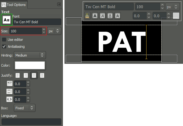 You may also not like the font that is chosen by default. In that case, we can change the Font to something better by clicking the icon. This will open a drop-down to scroll through all the fonts that GIMP knows about on your system. You can see in my example that I’ve changed the font to "Tw Cen MT Bold".