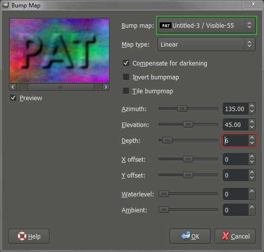 To get it working correctly, this plugin requires that you properly point to the source for the bump mapping. In our case the source is the text layer we created earlier (the layer was named "Visible"). So we’ll click on the spinner for the Bump map, and choose our "Visible" layer from the list.