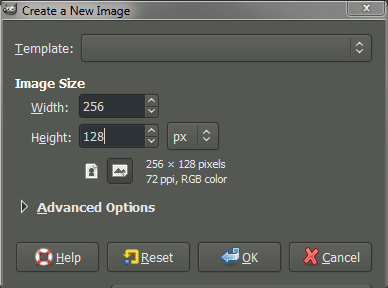 You can make this new image any dimensions you want, but for this tutorial I am going to specify a Width of 256 px, and a Height of 128 px. I haven’t specified any other options. When you're ready, hit "OK"" to create the new image.