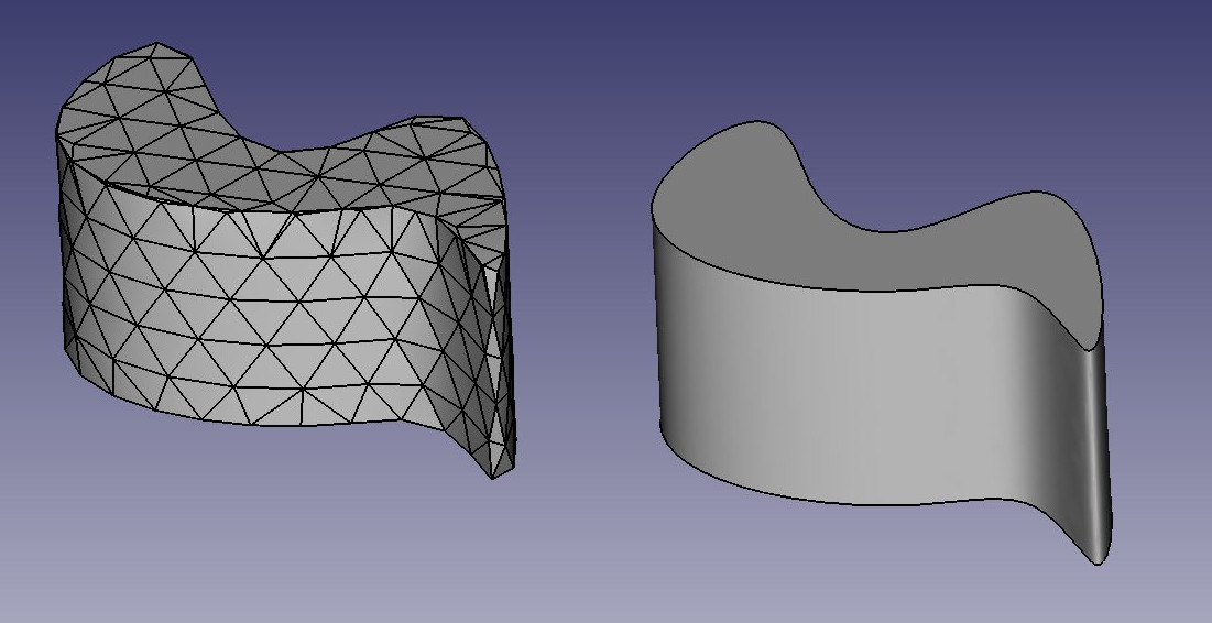 The difference between the two can be compared to the difference between bitmap and vector images. As with bitmap images, polygon meshes have their curved surfaces divided into a series of points. If you look at it closely, or print it very large, you will see not a curved but a faceted surface. In both vector images and BREP data, the position of any point on a curve is not stored in the geometry but calculated on the fly, with exact precision.