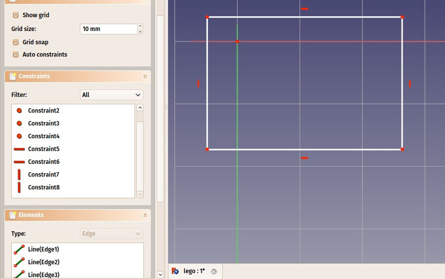 You will notice that a couple of constraints have automatically been added to our rectangle: the vertical segments have received a vertical constraint, the horizontal ones a horizontal constraint, and each corner a point-on-point constraint that glues the segments together. You can experiment moving the rectangle around by dragging its lines with the mouse, all the geometry will keep obeying the constraints.
