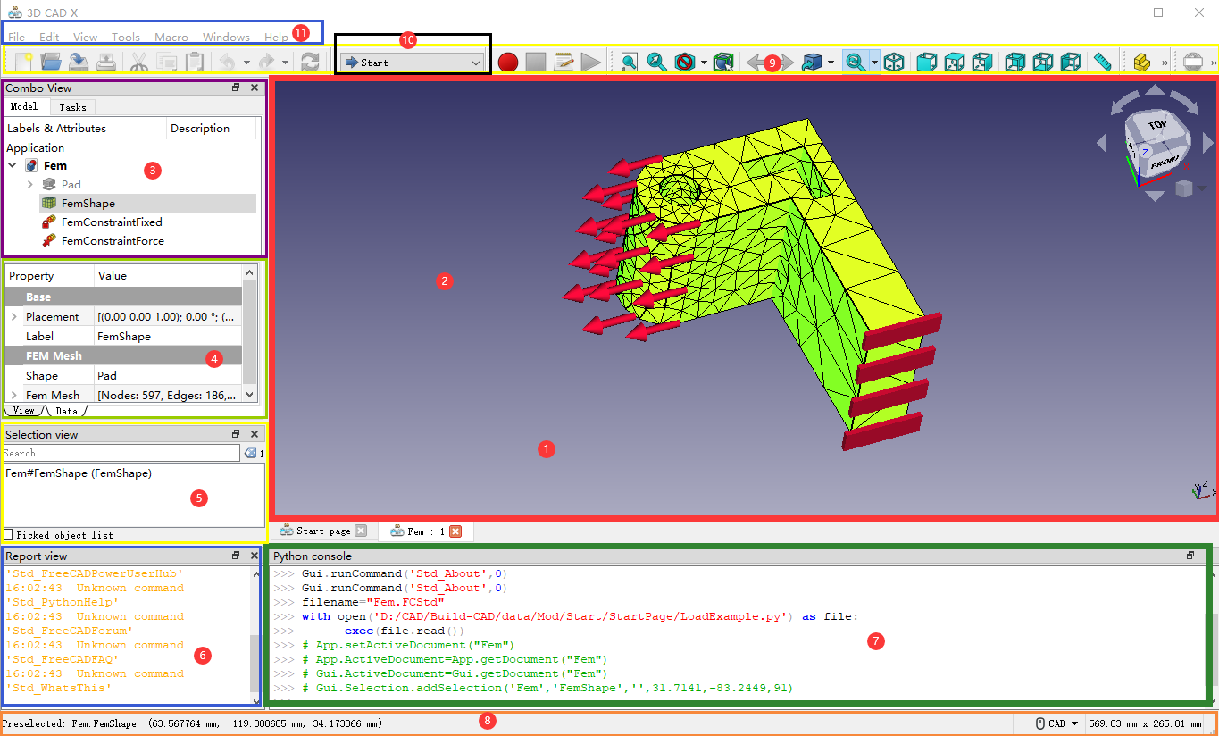 3. The tree view (part of the combo view), showing the hierarchy and construction history of objects in the document; it can also display the task panel for active commands.
