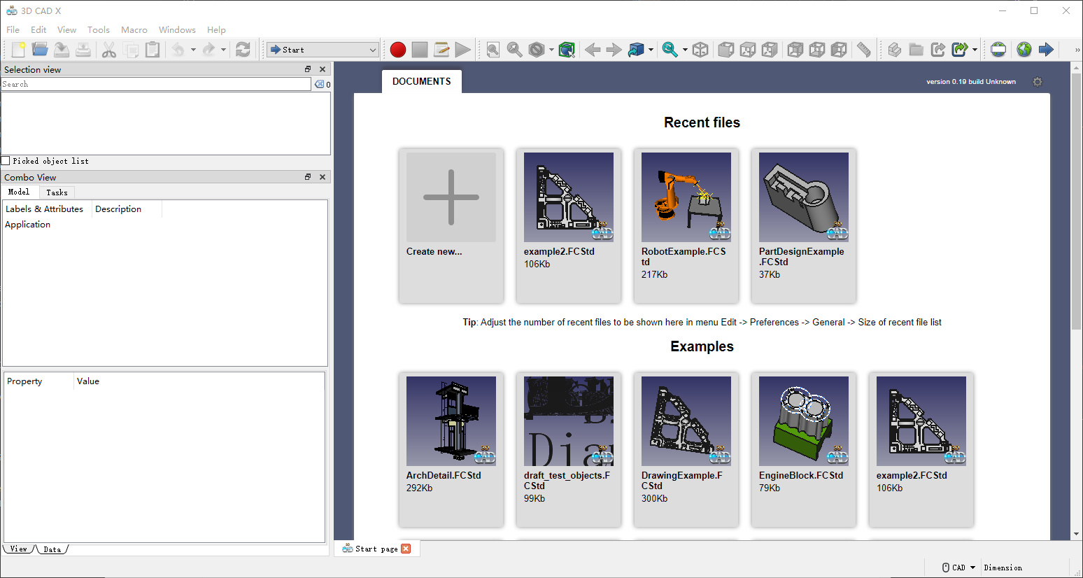 3D-CAD-X uses the Qt framework to draw and manage its interface. This framework is used in a wide range of applications, so the 3D-CAD-X interface is very classical and presents no particular difficulty to understand. Most buttons are standard and will be found where you expect them File → Open, Edit → Paste, etc. Here is the look of 3D-CAD-X when you open it for the first time, just after installing, showing you the start center:
