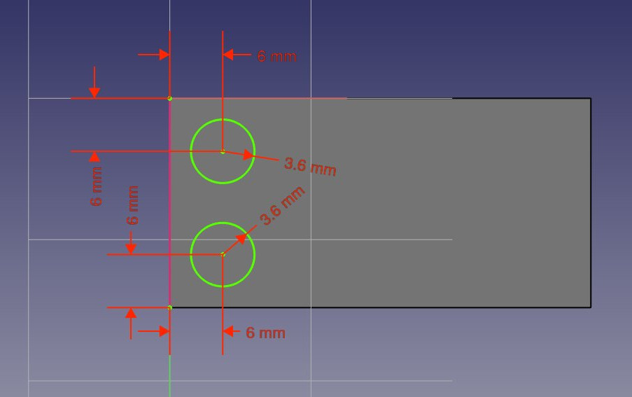 Place two vertical constraints and two horizontal constraints of 6mm between the center point of each circle and the corner points of the imported edge, so each circle has its center at 6mm from the border of the face: