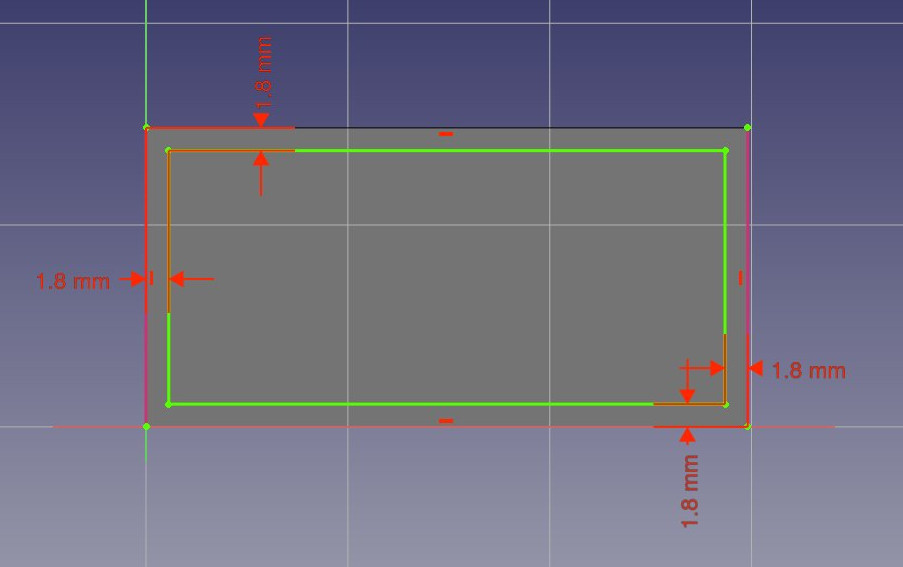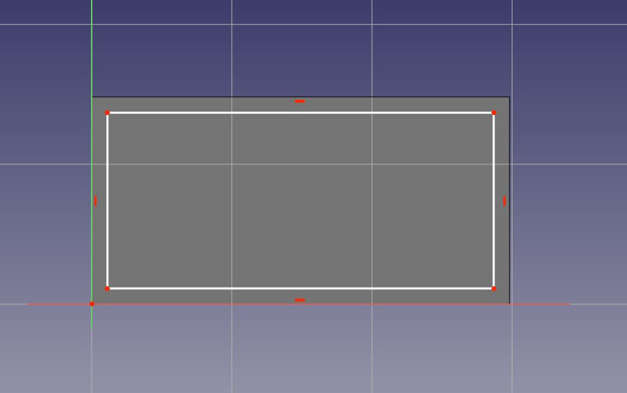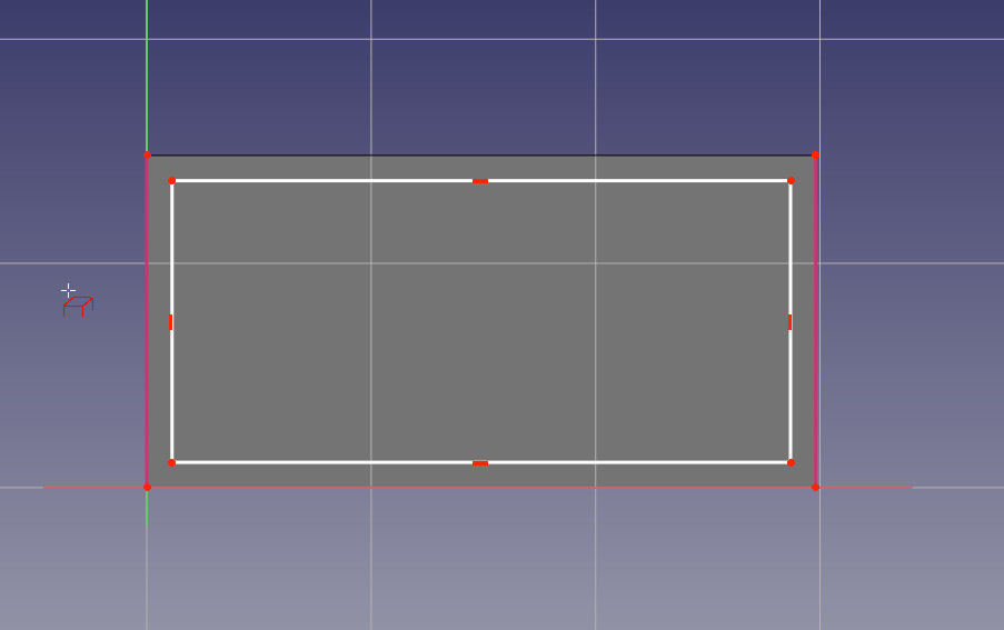You will notice that a couple of constraints have automatically been added to our rectangle: the vertical segments have received a vertical constraint, the horizontal ones a horizontal constraint, and each corner a point-on-point constraint that glues the segments together. You can experiment moving the rectangle around by dragging its lines with the mouse, all the geometry will keep obeying the constraints.