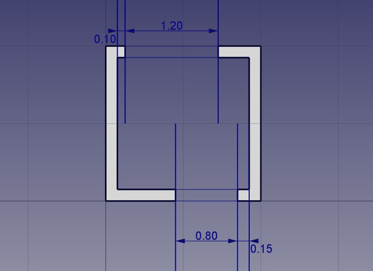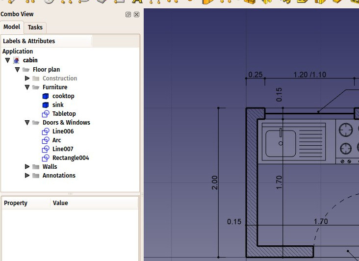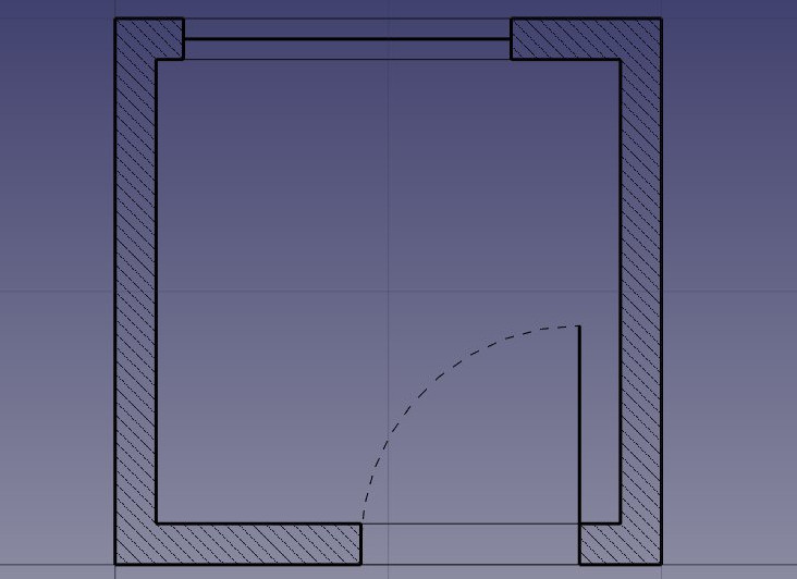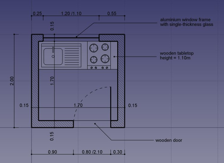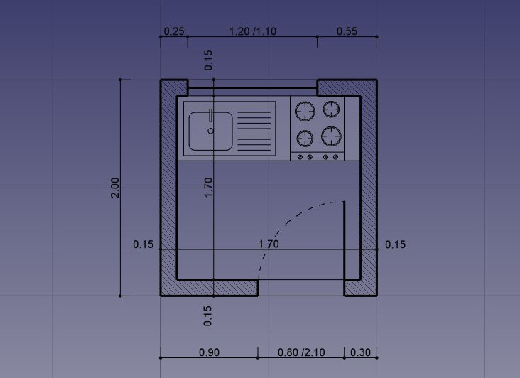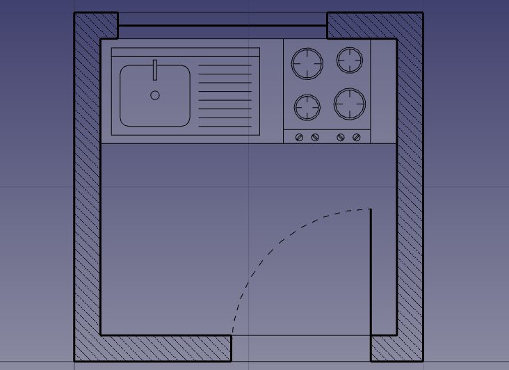 To showcase the workflow and possibilities of the Draft Workbench, we will walk through a simple exercise, the result of which will be this little drawing, showing the floor plan of a small house that contains only a kitchen top (A pretty absurd floor plan, but we can do what we want here, can't we?):
