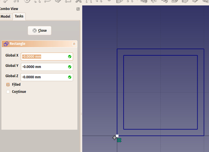 Then, select the Draft Rectangle tool and draw a rectangle, starting at point (0,0,0), of 2 meters by 2 meters (leave the Z at zero). Note that most of the Draft commands can be fully performed from the keyboard, without touching the mouse, using their two-letter shortcut. Our first 2x2m rectangle can be done like this: re 0 Enter 0 Enter 0 Enter 2m Enter 2m Enter 0 Enter.