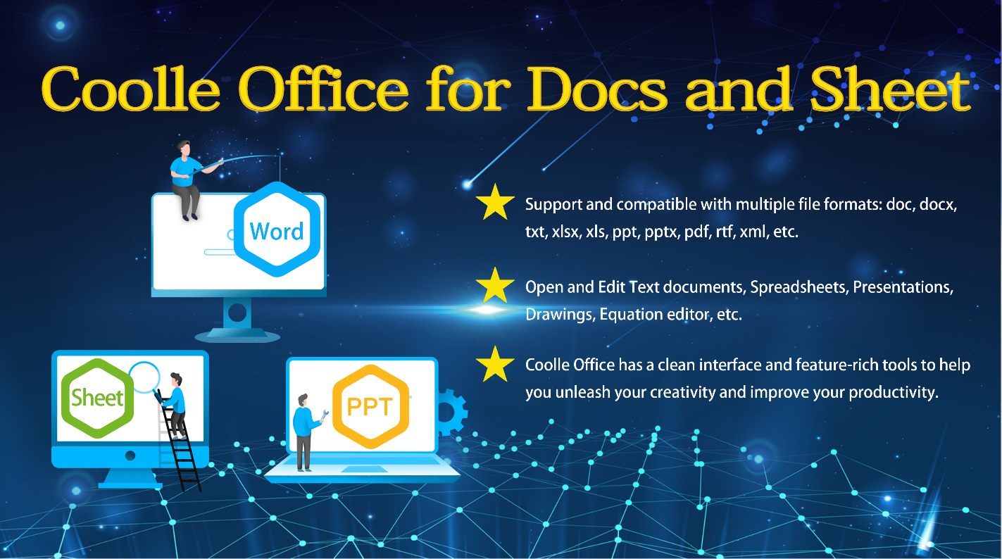 Coolle Office Suite offers an alternative to Word, Excel & PowerPoint. It's compatible with Microsoft Office (Word, Excel, PowerPoint & Txt), Google Docs, Google Sheets, Google Slides and OpenOffice format for Windows.