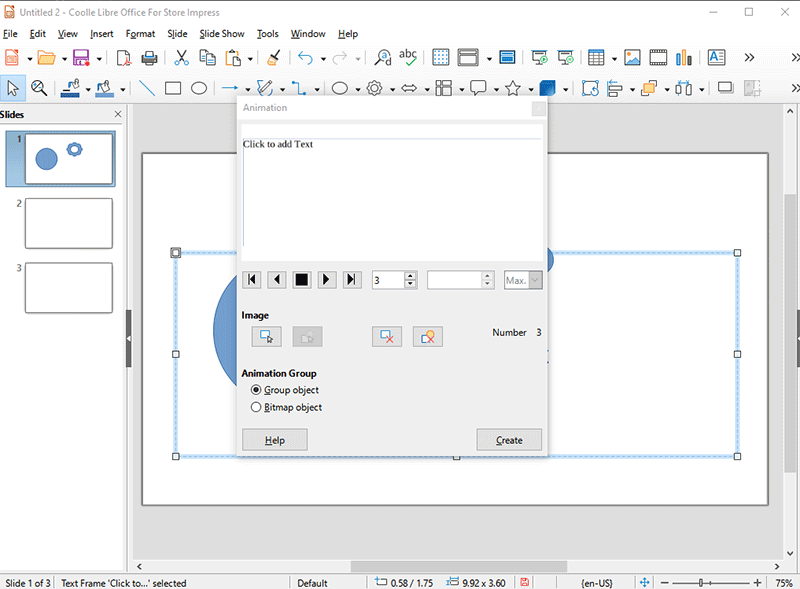 You can animate drawing objects, text objects, and graphic objects (images) on your slides to make your presentation more interesting. LibreOffice Impress provides you with a simple animation editor where you can create animation images (frames) by assembling objects from your slide. The animation effect is achieved by rotating through the static frames that you create.