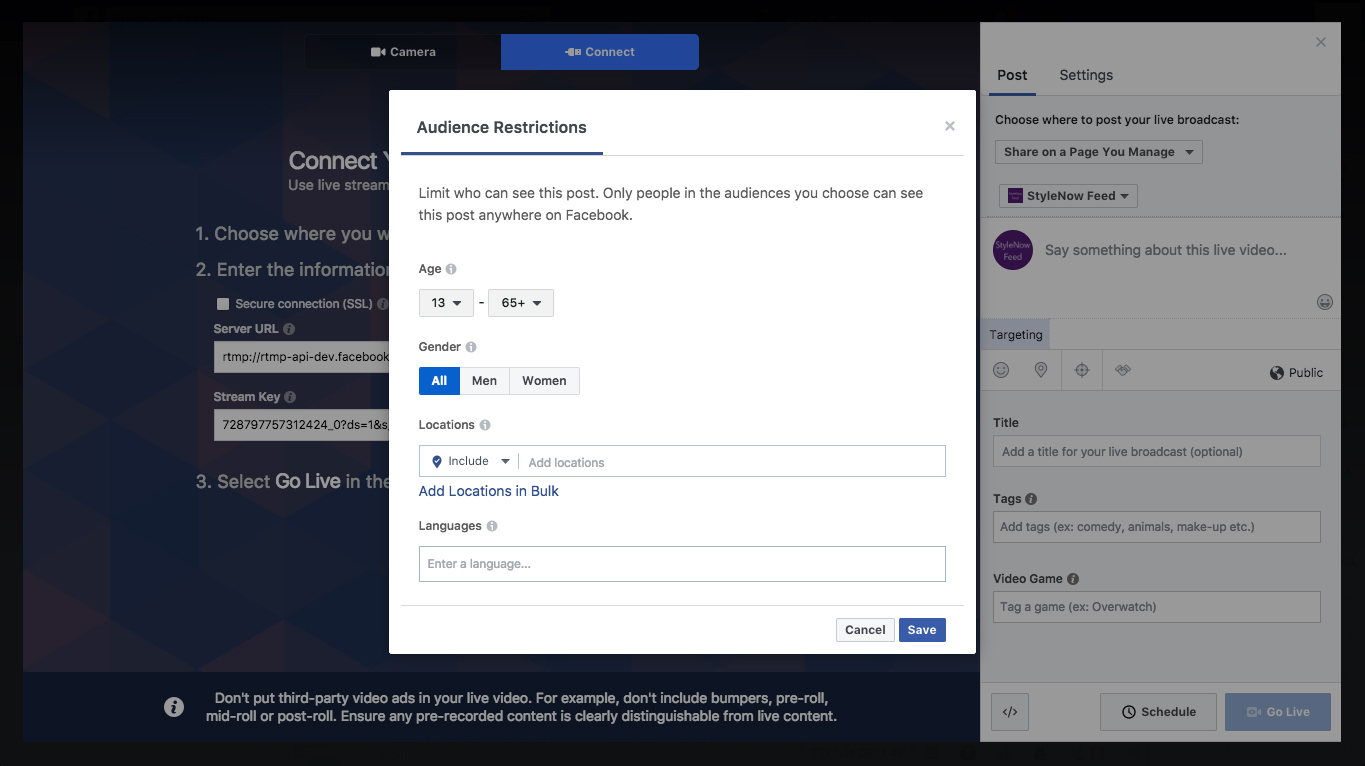 10. Add Audience Restrictions: If your need to restrict who sees your broadcast (for example, your broadcast rights only apply to certain countries), you can use Audience Restrictions.