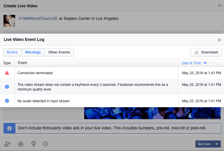 Important: The Server URL and Stream Key can only be used for a single Live preview/post connection. You must use the same URL and key to preview and post. That is, you cannot preview, stop the stream, and then resume at a later time. The URL and Key are valid for 7 days. Once you preview the video, you have up to 5 hours to go live. If you need more time, create a new stream key closer to the event time.