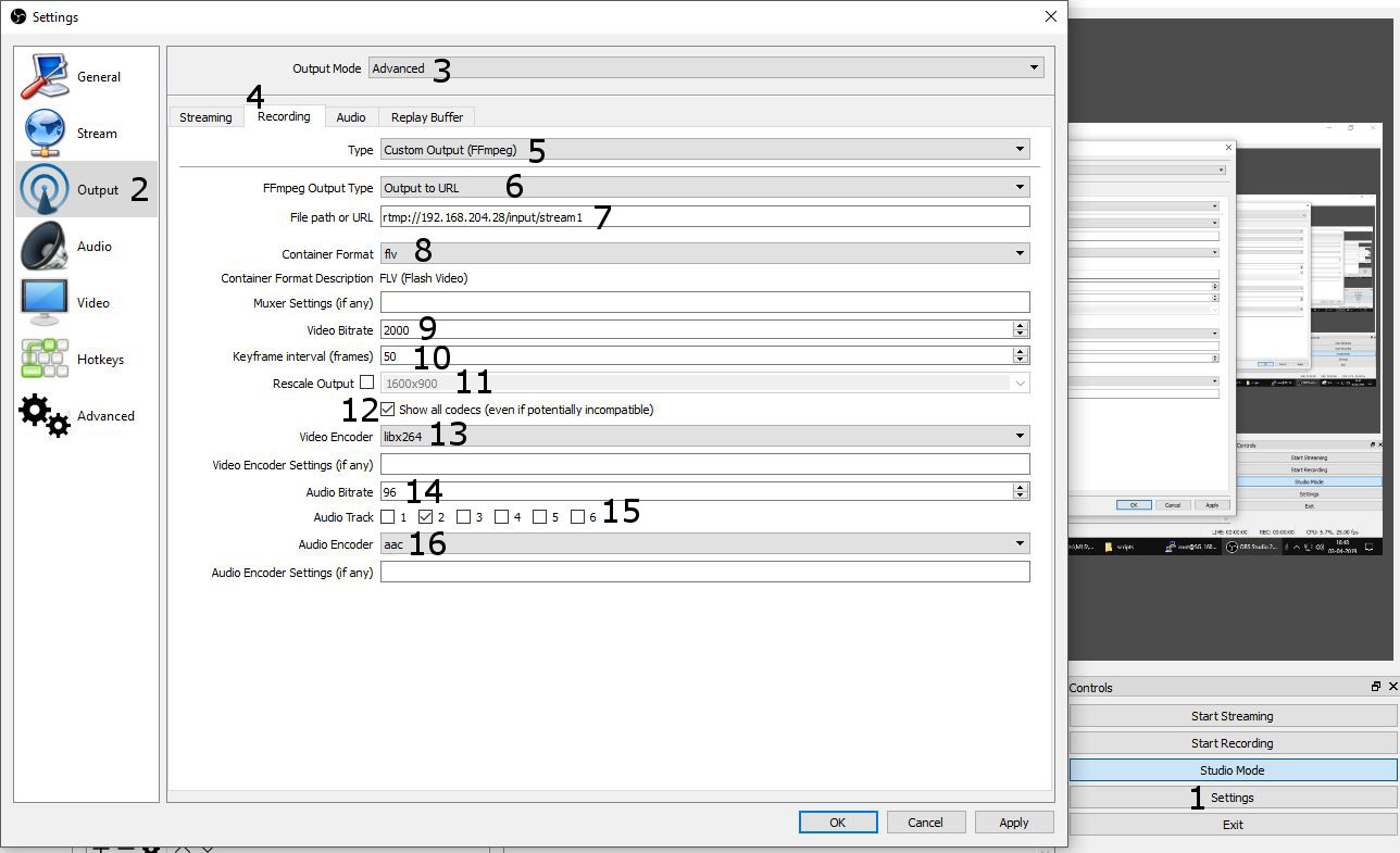 We use the Record option, but instead of recording to a file, we will "record" to the rtmp url. Rtmp destinations require the video container to be flv, the video codec to generally be libx264 and audio codec to be aac. Follow the image for instructions to set these up. The text below the image just spells out the same thing.